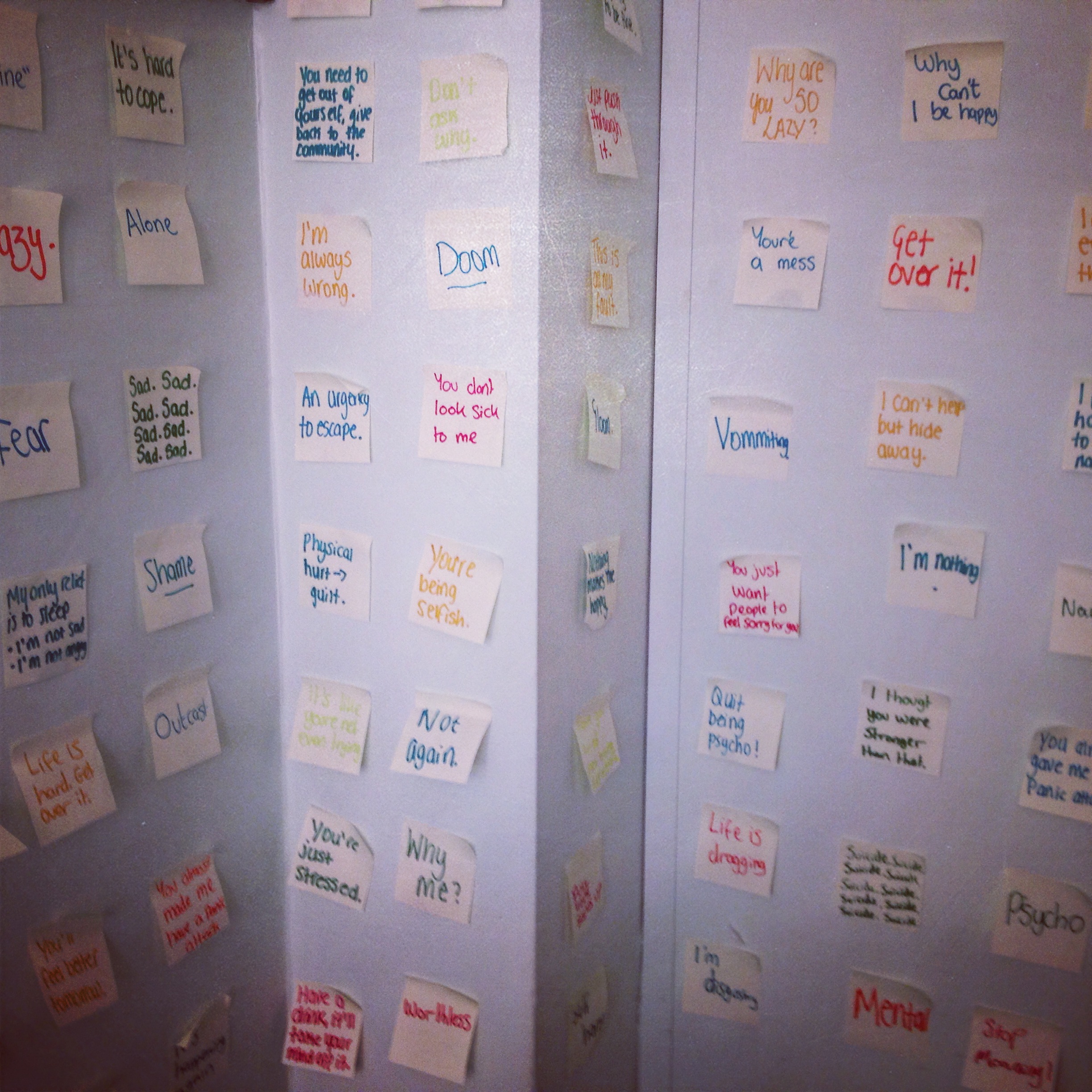 A room filled with 200 hundred post it notes, with negative post it notes about mental health. The audience got to change them with positive advice instead